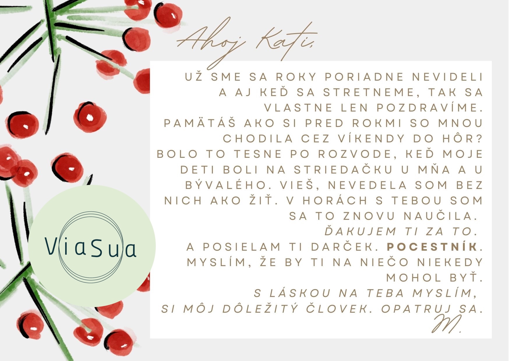 už sme sa roky poriadne nevideli a na keď sa stretneme , tak sa vlastne len pozdravíme. Pamätáš ako si pred rokmi so mnou chodila cez víkendy do hôr? Bolo to tesne po rozvode, keď moje deti boli na striedačku u mňa a u bývalého. Vieš, nevedela som bez nich ako žiť. V horách s Tebou som sa to znovu naučila. Ďakujem Ti za to. A posielam Ti darček. Pocestník. Myslím, že by Ti na niečo niekedy mohol byť. S láskou na Teba myslím, si môj dôležitý človek. Opatruj sa.